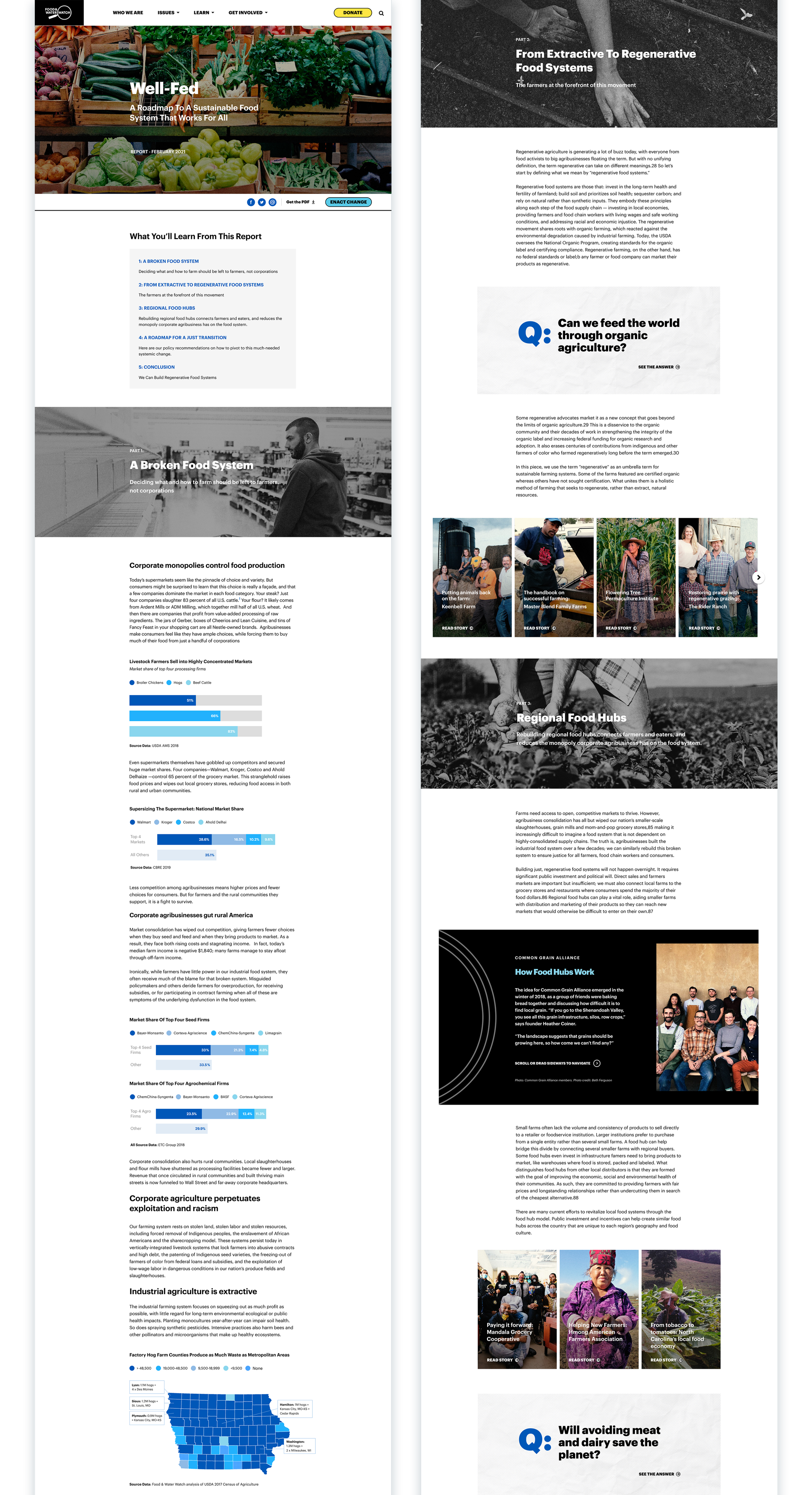 In an effort to shape public opinion and legislative action, Food & Water Watch’s research team produces dozens of long-form print reports which showcases hard-hitting evidence to stop the polluting industries. The digital content and strategy team had a very tall task with reimagining how the print reports could be presented on the website in an engaging and interactive manner.